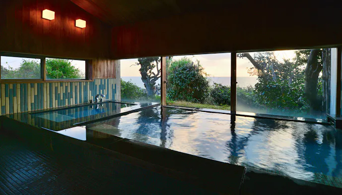 全ての客室が海に面しており、ウッドテラスで眺めることができるのは、目前に迫るような南紀州の海の絶景。客室棟の回廊奥にあるオーシャンビューの大浴場には、古くから「美肌の湯」として知られる椿温泉から引いた、源泉掛け流しの湯が注がれます。湯上りにサロンで涼んだ後は、紀州鯛やカマスなど、地元の海の幸をふんだんに使った夕食を、お部屋でゆったりといただきましょう。