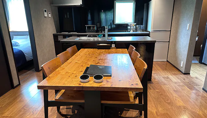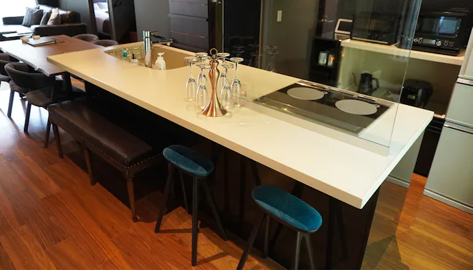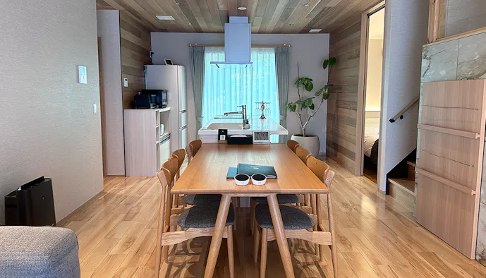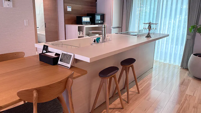 その奥にはテーブル、そして奥にはキッチンスペースを完備。カウンターキッチンには、ハイチェアも完備されているのでお料理をしながらお喋りをしたり、ちょっと飲み物をカウンター越しに楽しんだり、様々なシーンで活躍しそうです。