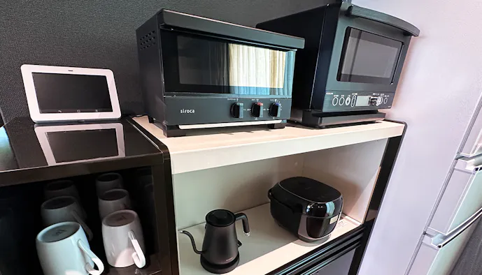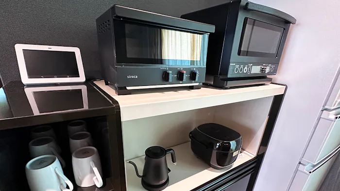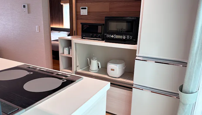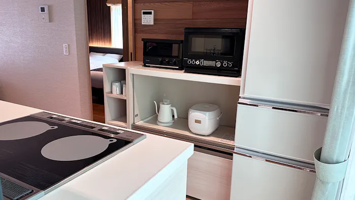 キッチンはアメニティが充実!炊飯器や電子レンジ、トースター、さらには大容量の冷蔵庫などの調理家電が勢ぞろい。
