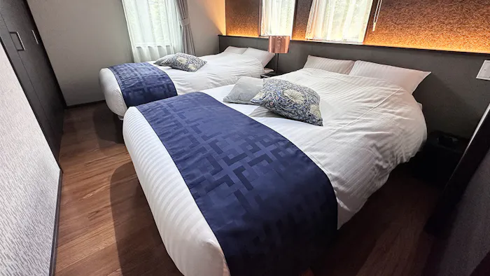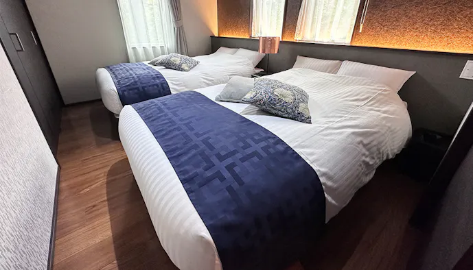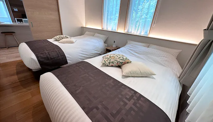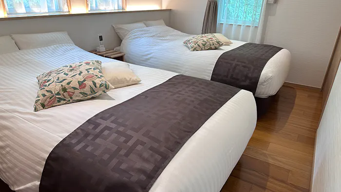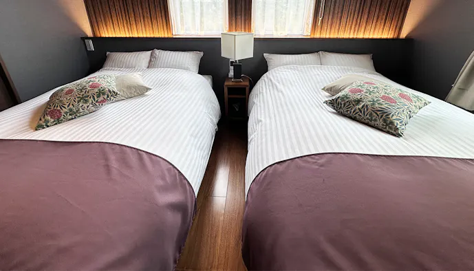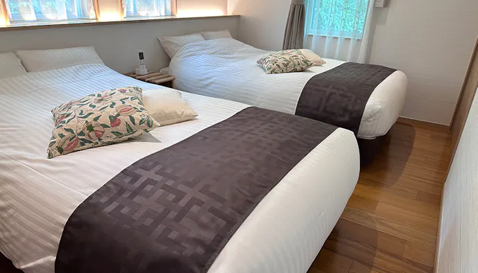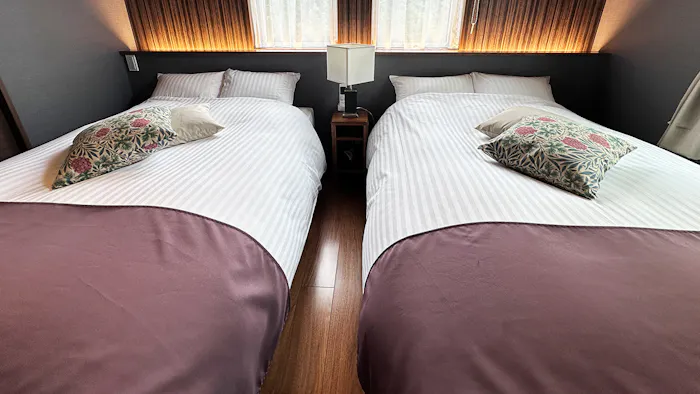 ベッドルームは2つ。1つ目は、キッチンスペースの横に、そして2つ目はアウトドアリビングの前にあります。ベッドは全部で4つあるほか、和布団が2組用意されているので、全部で6名まで滞在が可能です。パジャマ等の寝間着は用意がないので持参しましょう。