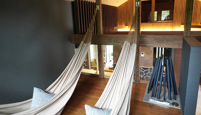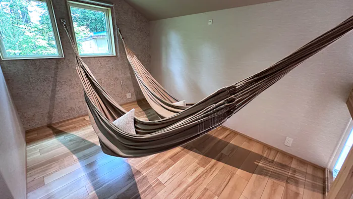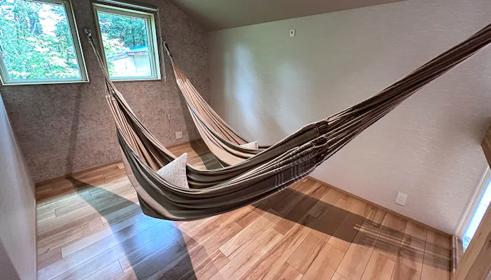 中2階には、ハンモックを完備!2つ並んでいるので、ゆったりとハンモックに揺られながらお喋りを楽しむのもいいですね。窓の外からこぼれる木漏れ日を浴びながら、うたた寝するのも気持ちよいはず。