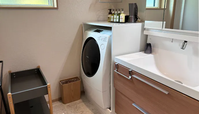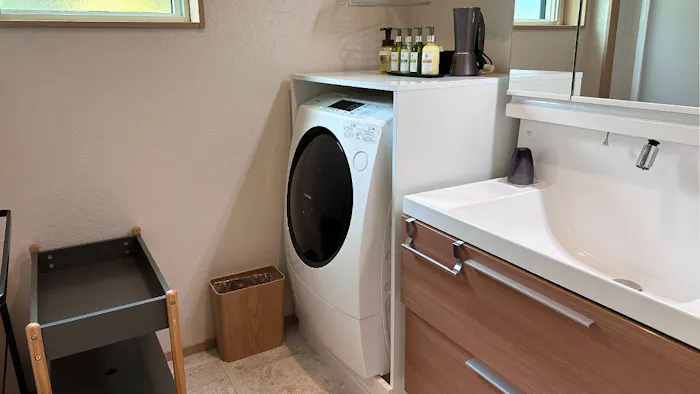 洗面スペースにはドラム式洗濯乾燥機が備わるので、長期での滞在時も安心。