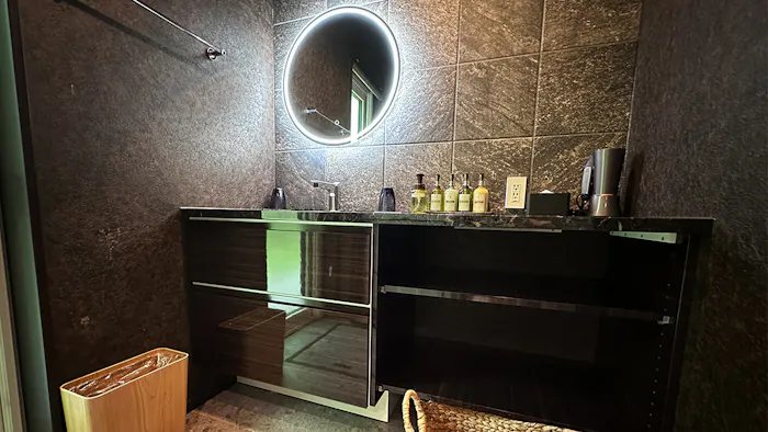 水が流れ落ちる様子を、壁面上部にあるフィン型のウッドパネルとリブ形状で表現し、壁面下部に位置する割れ石タイルはその流れを受け止める石に見立てているそう。床のタイルは、水面下の砂利を表現しています。