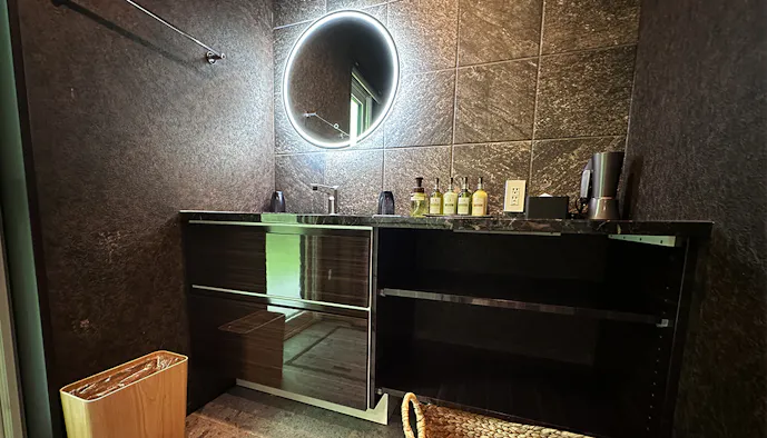 洗面所やお風呂場も高級感溢れる洗練された雰囲気。ハリウッドミラー付なのはこの部屋ならでは。