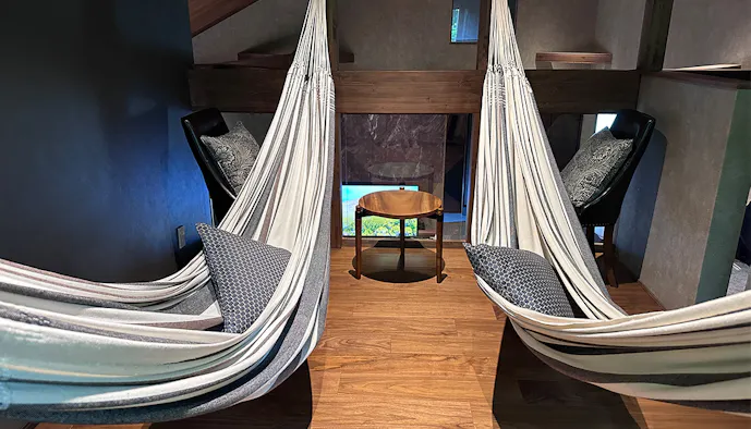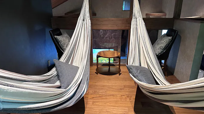 中2階にはハンモックと、ちょっと休憩するのにぴったりな椅子、そして小さなテーブルも完備。全体的な造りは同じですが、それぞれのお部屋ごとに少しずつ仕様やテーマが違うのが面白いです。