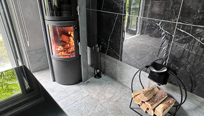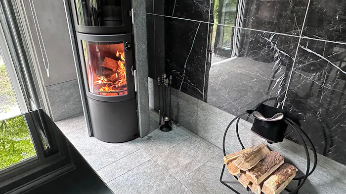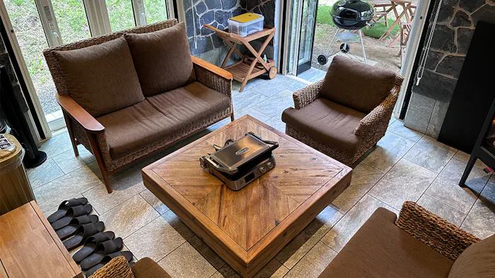アウトドアリビングは、石のタイルとブラウンを基調としたお洒落な空間。昼間はBBQ、夜は薪ストーブの火を見ながら歓談するなんて素敵ですね。