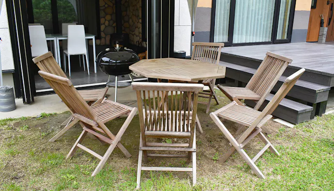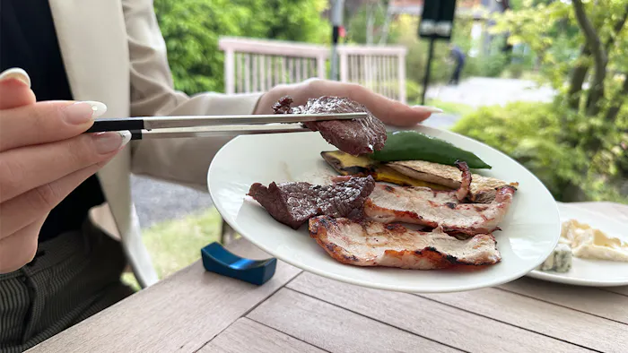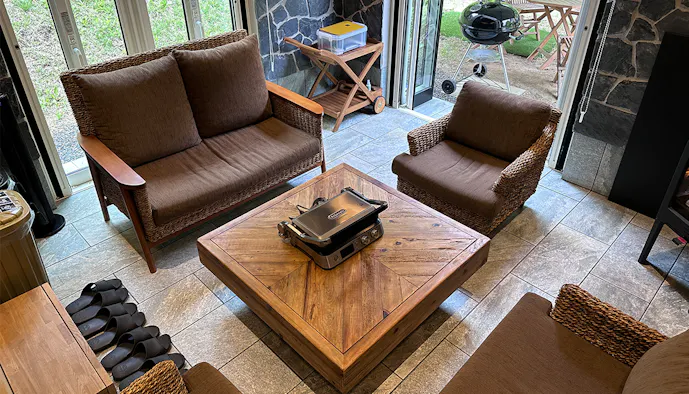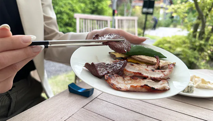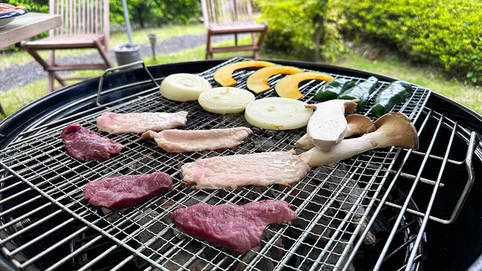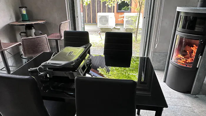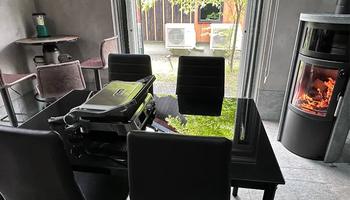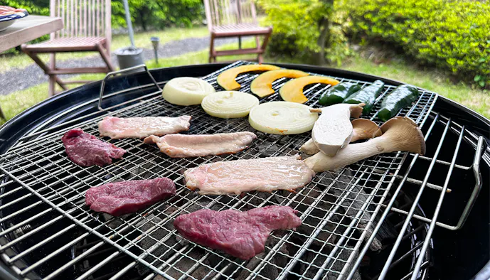 緑に囲まれた空間でいただくBBQは開放感抜群!鳥のさえずりをBGMに友人や家族との会話も弾むことでしょう。肌寒い季節はアウトドアリビング内の薪ストーブで暖を取りながら、BBQを楽しむのも素敵です。