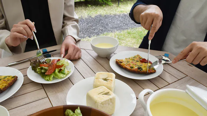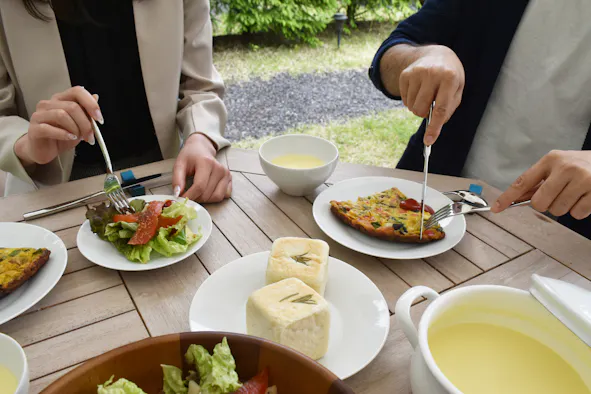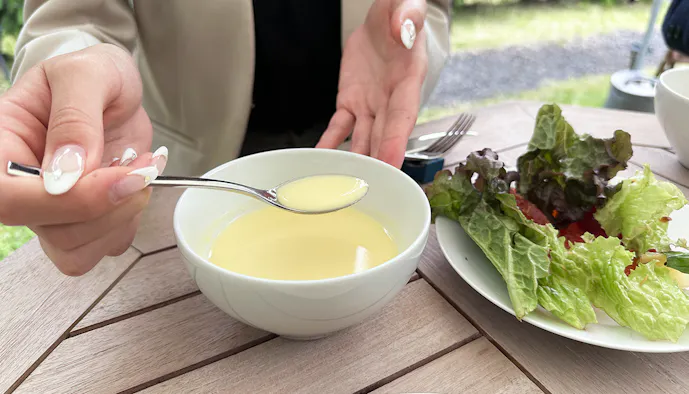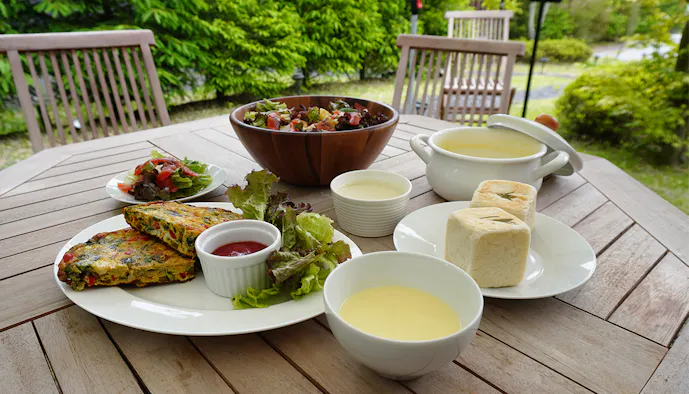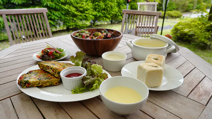 朝食付きプランでは、「GREENSEED軽井沢」内に併設される「レストラン Naz」で用意していただけるイタリアン朝食を楽しめます。季節の野菜スープ、フリッタータ(イタリア風オムレツ)、自家製フォカッチャ、サラダがついてきます。