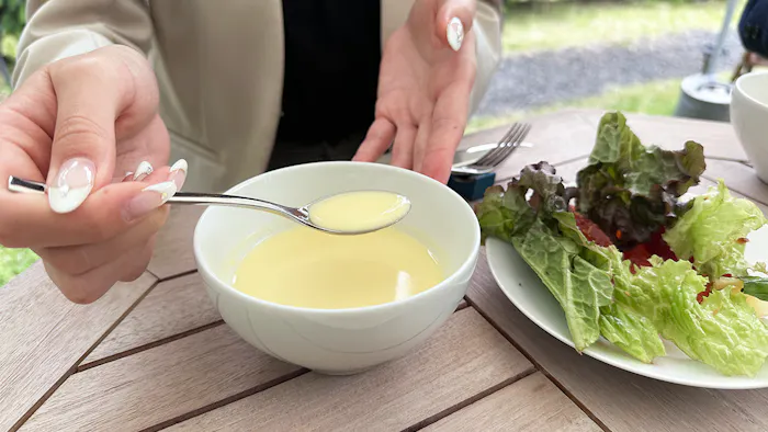 季節の野菜スープは、今回は根セロリでした。とっても甘いのに、砂糖などは一切添加せず、素材本来の甘味だけでできているそう。