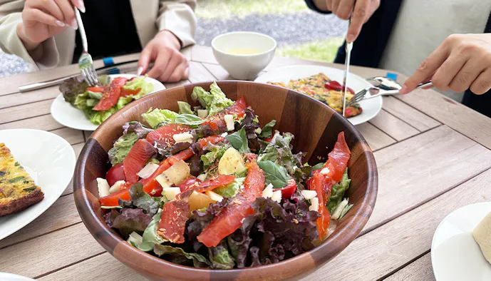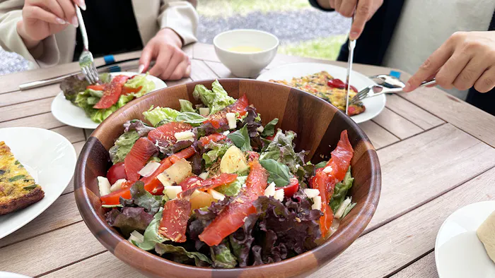 シェフが厳選して朝採りした、山盛りのサラダは自家製ドレッシングと一緒に。野菜のフレッシュさと自然な甘味が絶妙なドレッシングをかけると野菜がどんどん進みます。自分たちで買ってきたものを調理して食べるのも楽しいですが、名店「レストラン Naz」の味を朝から楽しめるのはここだけの特権です!