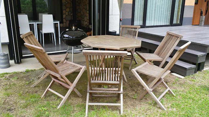 アウトドアリビングにあるテーブルや椅子も黒で統一。大人な空間でBBQタイムを楽しめそうです。