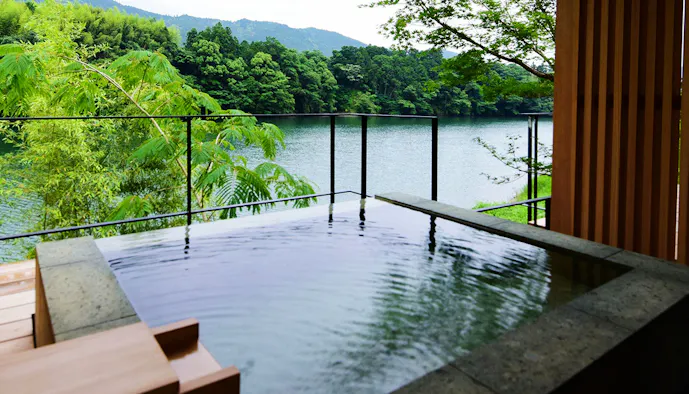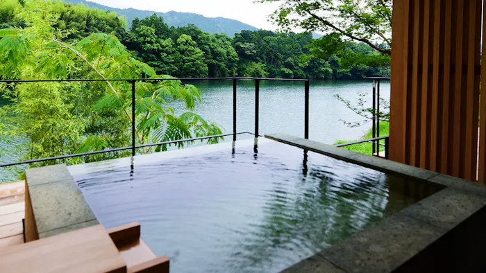 離れの意匠はそれぞれですが、緑にどっぷり浸って過ごすなら「【 洸 -kou- 】ワイドキングベッド/檜露天風呂」がおすすめ。ウッドデッキの露天風呂にはとろみのある純重曹泉が注がれていて、温泉気分がマックスに。旅装を解く間も無く、湯に浸かりたくなりますよ。