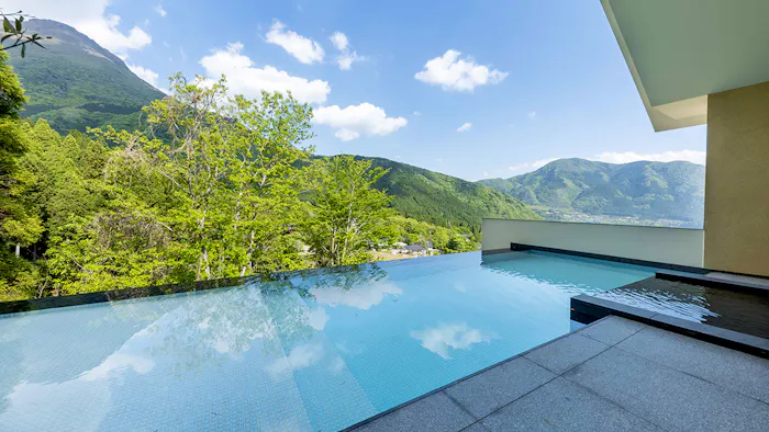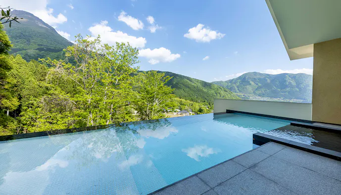 由布岳ビューを望むなら「ヒルトップ スカイパビリオンB 由布岳ビュー」へ。温泉露天風呂から、あるいはインフィニティプール越しに見る由布岳は、まさに言葉を失うほどの美しさ。木や石を多用した客室のデザインも、シンプルながら高級感のある佇まいです。