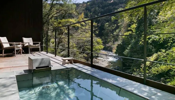 伊豆・湯ヶ島の川沿いに佇む「arcana izu」は、大人だけが宿泊を許されたオーベルジュ。渓流を望む全16室のお部屋には、源泉掛け流しの湯が注がれる露天風呂が備わります。