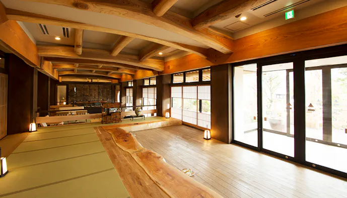 東京から車で約2時間という、立地の良さも魅力的な「強羅花扇 円かの杜」は、随所に木肌のぬくもりを感じる温泉宿です。