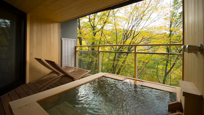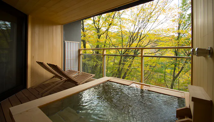 お部屋は天然温泉が注がれる露天風呂付き。カルシウム、硫酸ナトリウムを含む柔らかな泉質は、長時間してゆったりと入浴するのに最適です。自然の息吹を感じながら、プライベートな湯浴みを楽しんでみてはいかがでしょうか。