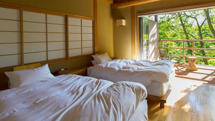 全て山庭に面する16室の客室は、シンプルで洗練された空間。窓の外側には、四季折々に移り変わる木々の景色を間近に望むことができます。
