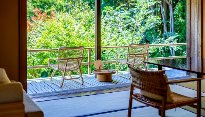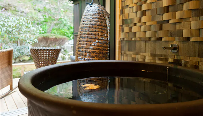 木の温もりが漂うお部屋は全9室。そのうち「離れ 観月庵」は、敷地内の一番の高台にあって、箱根の山々を一望。華美な装飾はありませんが、内湯に伊豆石を用いた湯船を設置。無色透明の自家源泉・ナトリウム塩化物泉の湯を湛えています。