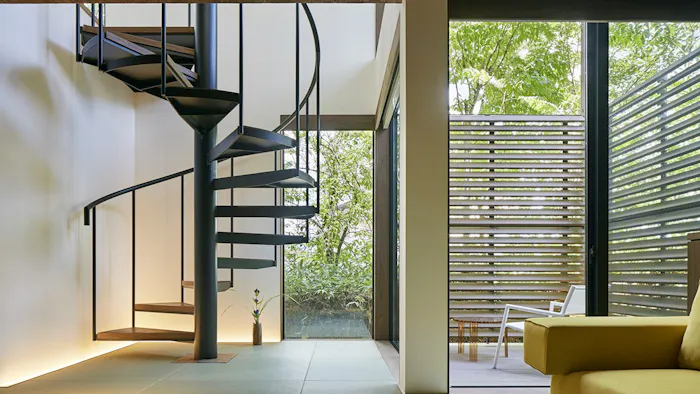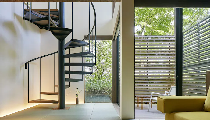 湯畑から歩いて約3分。草津温泉の地蔵通りにある「草津温泉 炯-kei-」は、7つのモダンな客室を備えた大人限定の宿。特にメゾネットタイプの客室は、螺旋階段が上と下を繋ぐ大空間が特徴で、開放感にあふれています。