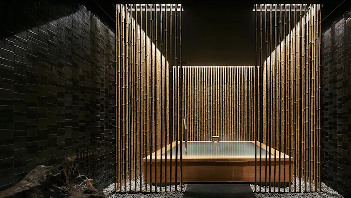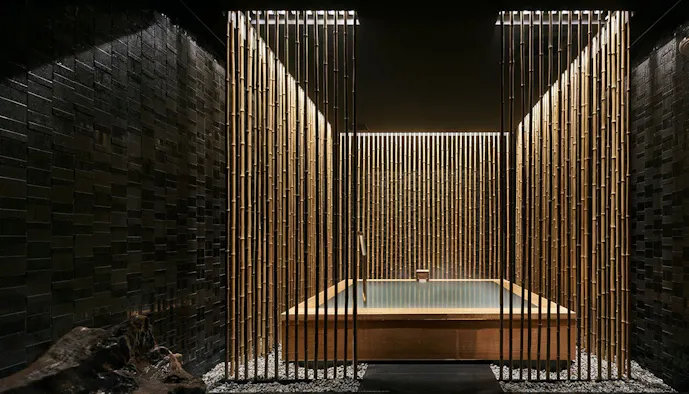 この宿では3ヵ所ある貸切風呂をすべて制覇すべし!湯温の異なる3つの浴槽を並べた「AWASE」では、草津古来の入浴法に触れられます。浴槽を竹で囲んだ「HIKARI」は、じっくり草津の湯と向き合える設え。以上の2ヵ所は地蔵源泉です。そして、万代鉱源泉を引くのが露天の「RYOKU」。いずれの貸切風呂も予約不要で、空いていれば何度でも楽しめます。