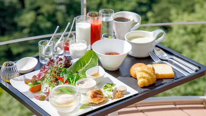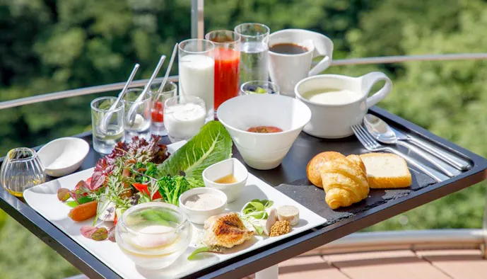 朝食は“インガーデン”と呼ばれる客室のテラスで。高台の際に佇むだけあって、伊豆大島や初島が浮かぶ相模湾を眺めながらの朝食は格別な気分!チェックアウトが12時だから、急ぐ必要はありません。朝食後は、エステ(9時〜)もOK。もちろん再度の温泉も、ぜひどうぞ。