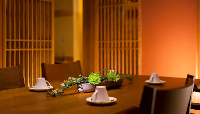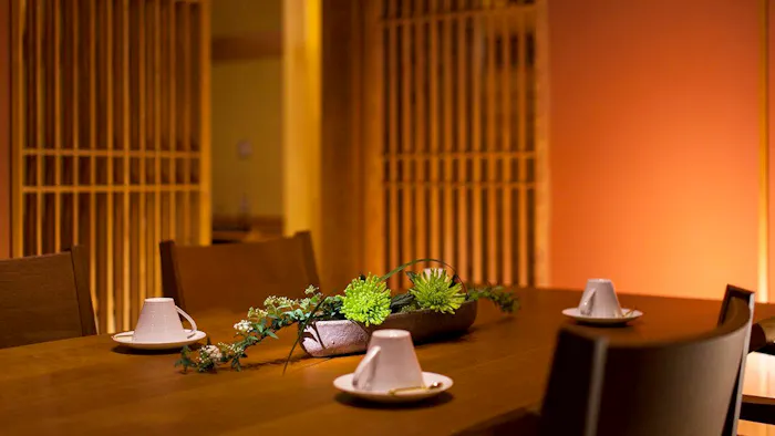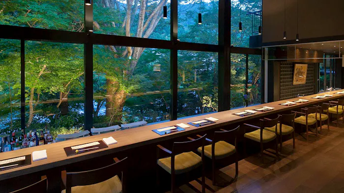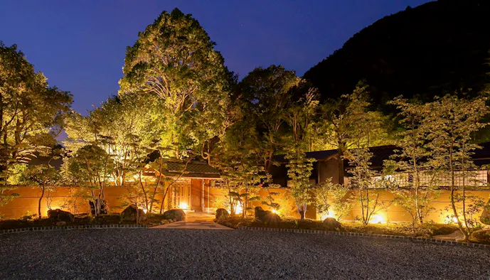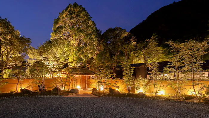 ライトアップされた庭を見渡すリバービューカウンターでいただく夕食は、厳選した地元食材を使用した伊豆会席。特に、目の前の川で獲れた鮎は「今まで食べた中でいちばん」と話す人が大勢いて、ゲストを感動させています。