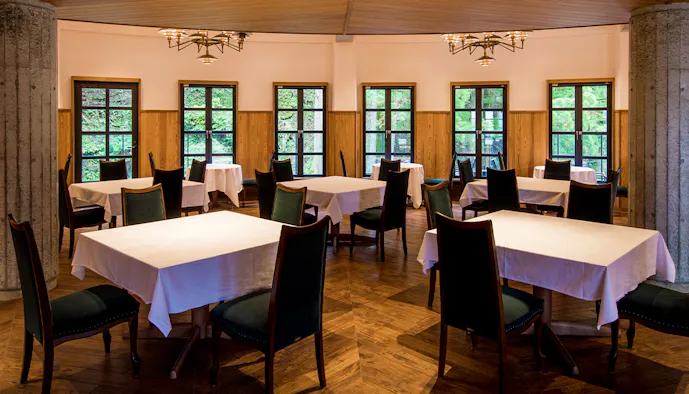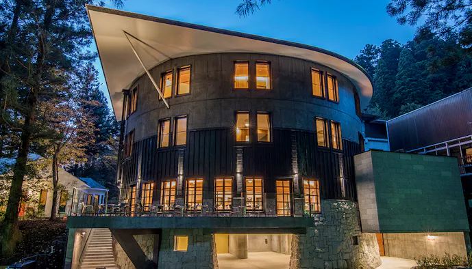 「日光東照宮」の西参道沿いに立つ「日光西町倶楽部あらとうと」は、利用を中学生以上に限った宿。円形型の本館に6室、平屋の別邸に3室あって、全室スイート仕様。大谷石をアクセントに用いたインテリアはナチュラルな趣で、樹齢360年の杉並木の参道を眺められる客室もあります。