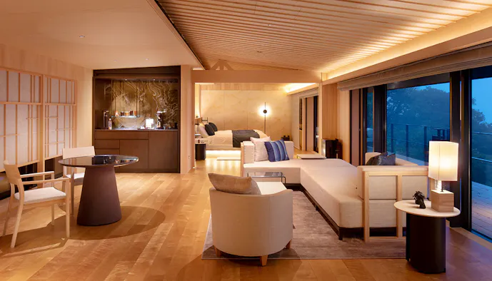 9室ある中で、一番のおすすめが2023年5月に誕生した「贅奏-Zeiso-」。広さ120平米の贅を尽くしたスイートで、お部屋から見る鳴門の海の美しいこと!特に鳴門大橋から昇る日の出は感動必至で、いつまでも眺めていたくなります。