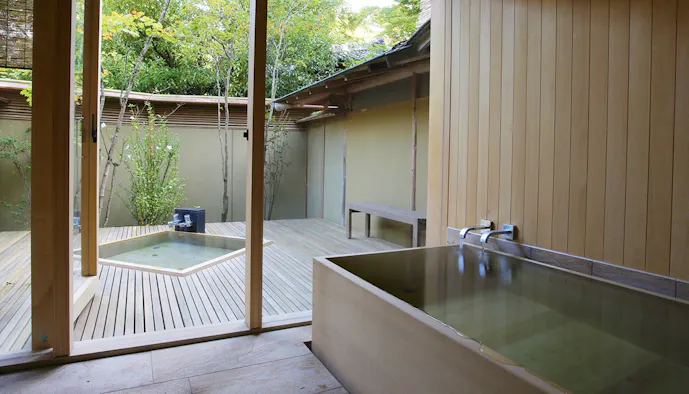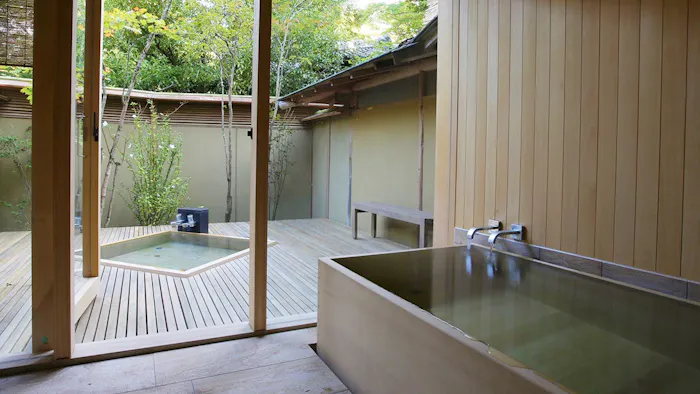 10室ある客室はすべてが離れで、すべてが露天風呂付。しかも「縹 /千草 ‐露天風呂付き ‐露天風呂付き離れ‐【部屋食】」なら、足湯まであるので湯三昧。pH9.2のとろっとした湯が、肌も心もピカピカにしてくれます。