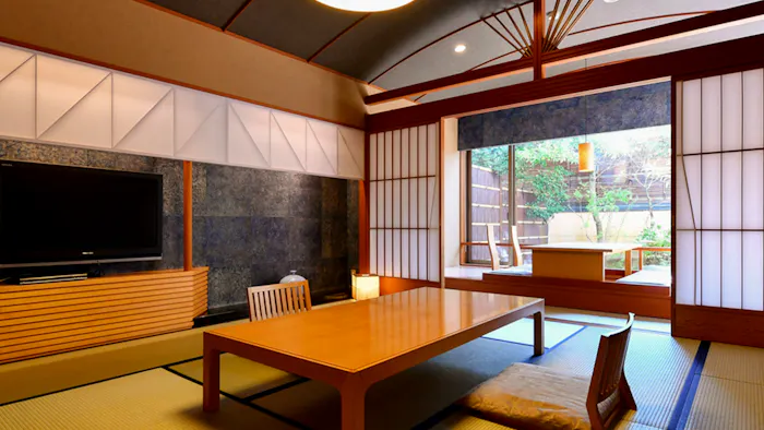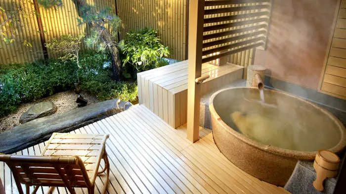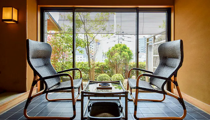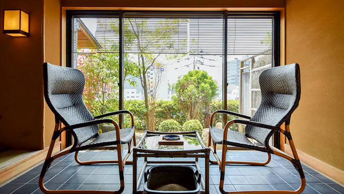 おすすめのお部屋は「【露天風呂+8畳】スーペリア【桜】」。書院造りの8畳の和室、庭に面した椅子のリラックススペースに加え、石造りの露天風呂もあって、一人で過ごすには十二分過ぎるほど。部屋食も可能で、茶道の心得のある仲居さんが美しい所作でもてなしてくれます。