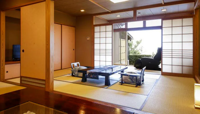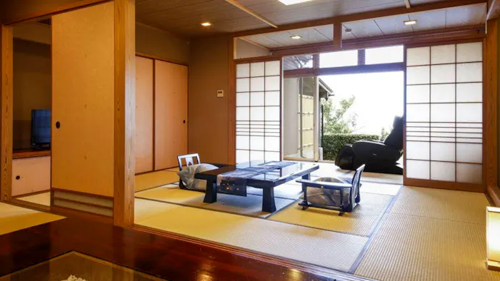 11室あるうち「露天風呂付和室(マッサージチェア付)」は、二間続きの和室のお部屋。マッサージチェアもあって、リラックス度は抜群。とろみのある湯に浸かってはマッサージし、また温に浸かっては……の、幸せなリピートを楽しみましょう。