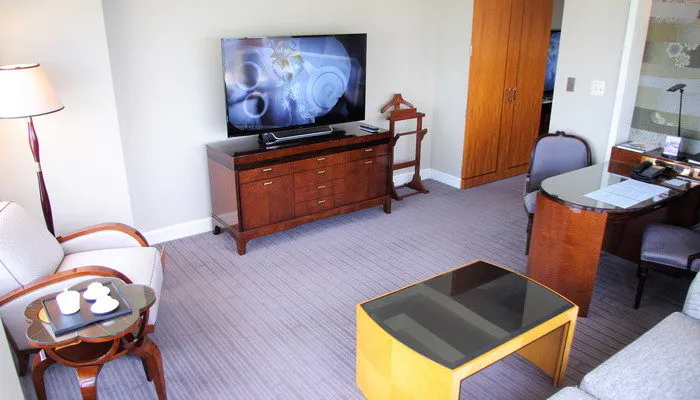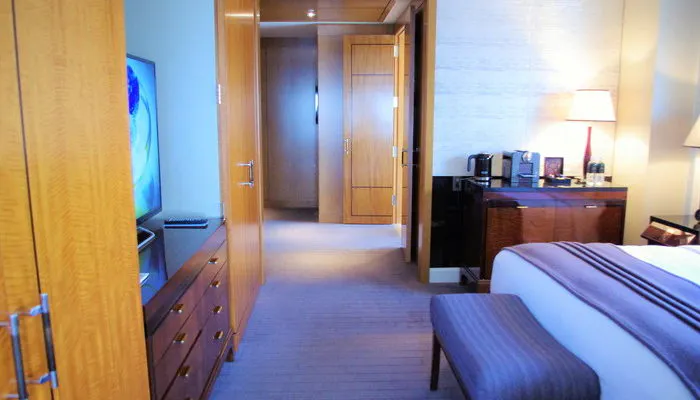 ドアを開ける瞬間は、いつものことながらドキドキなのです。特に玄関からお部屋までのアプローチが長ければ長いほど、期待感が膨らみます。御多分に漏れず、このクラブ ミレニア スイートも……! 広々とした客室玄関から、バスルーム、ベッドルーム、リビングルームと、縦に並んでいて、夢の世界の扉を開けたように心が弾みます。