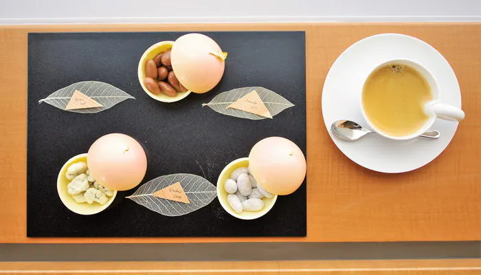 それぞれの蓋を開けてみると、中にはアーモンド、ピーカンナッツ、ヘーゼルナッツのチョコレートが入っていました。桃の形をした容器もホワイトチョコレートでもちろん美味しく食べられます。