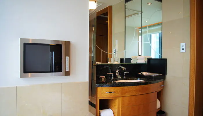 景色を存分に堪能したら、テレビを見ながらゆったり半身浴。寝そべりながらお風呂に入っても頭にフィットするバスピローがあるので、首元も快適です。また、バスソルトは2種類用意されているので、夜と朝、違った香りを楽しめました。