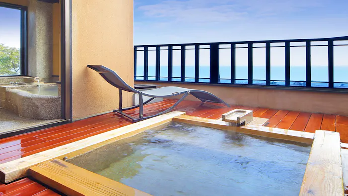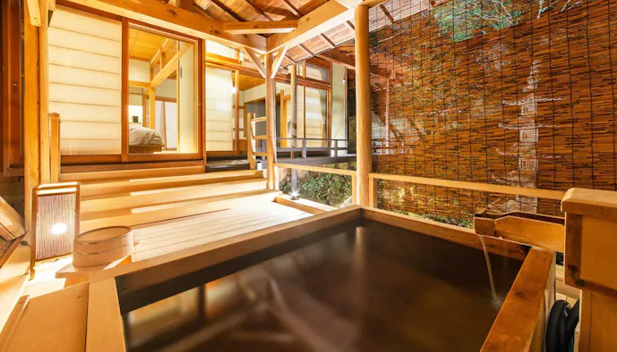 静岡県・伊豆高原、大室山の麓に佇む「お宿うち山 伊豆高原 全室露天風呂付き隠れ宿」は、約1,000坪の敷地を有する温泉宿。敷地内にはメゾネットタイプの離れ客室が全部で6棟点在しています。客室は木の温もりを感じる古風な設えで、2階部分には伊豆の絶景を望む展望露天風呂を配置。昼は海と山の雄大な景色、夜は満天の星々を独り占め。豊かな自然に溶け込むような湯浴みのひとときが叶います。