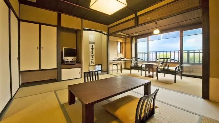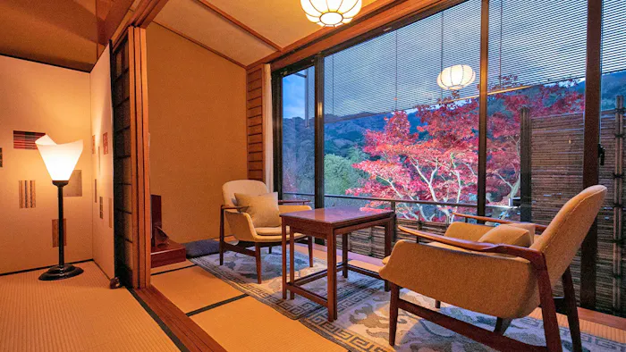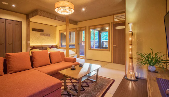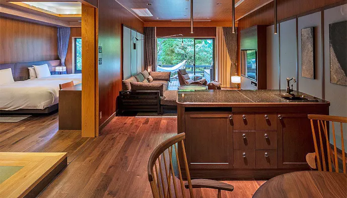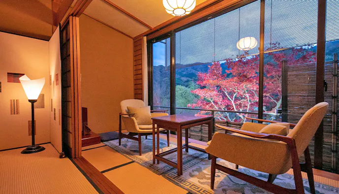 大正モダンな雰囲気が漂う「箱根・翠松園」は、全室に自家源泉掛け流しの露天風呂が備わる温泉宿です。敷地内にあるのは、かつて三井財閥の別荘として建てられた登録有形文化財「三井翠松園」。現在は「料亭 紅葉」としてリノベーションされており、歴史ある建物の中でお食事を楽しむことができます。レイトチェックアウトも可能で、「ラグジュアリースイート/ツイン」の客室には13時まで滞在可能なプランも。