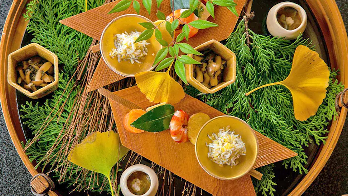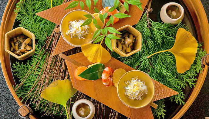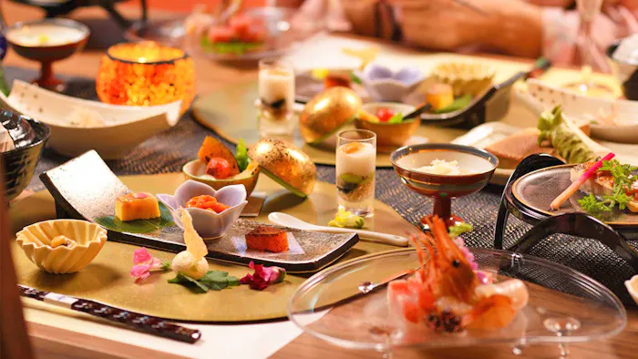 夕食に並ぶのは、華やかな日本料理の数々。八寸から始まるコース仕立ての料理が、季節の訪れを感じさせてくれることでしょう。さらに、翌日の朝食も必見です。お部屋ごとに提供される土鍋炊きのご飯をはじめ、味が濃く香り高い海苔や、毎朝にがりを打って作られるお豆腐といった逸品たちがずらり。夕朝食ともに、気兼ねなくお部屋でいただけるのも嬉しいですね。