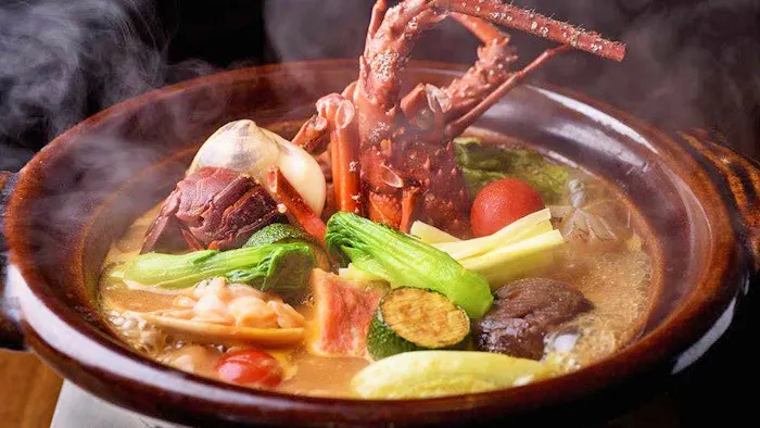 夕食には、職人の技が光る日本料理をコースでいただけます。通常コースに加えて、さらに上質な料理を楽しめる「特選献立」や、宿自慢の鍋料理「海香鍋」が登場するプランなども用意。「海香鍋」は、伊勢海老や蛤といった魚介類を“和風ブイヤベース”としてアレンジしたもの。食材の旨味が溢れ出たスープは、やみつきになるほどの味わいです。