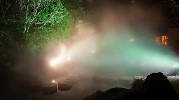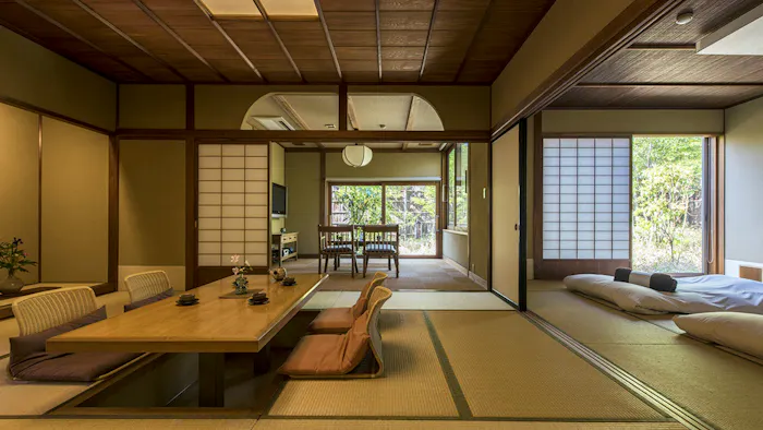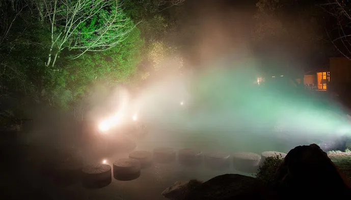 どのお部屋にも独立した専用のダイニングルームが設けられています。しかもスタッフ専用の出入口まで!文字通り、プライベート感たっぷりのおこもりステイが完結しますよ。毎夜7時30分から日本庭園で繰り広げられる光と音楽のショーも好評です。
