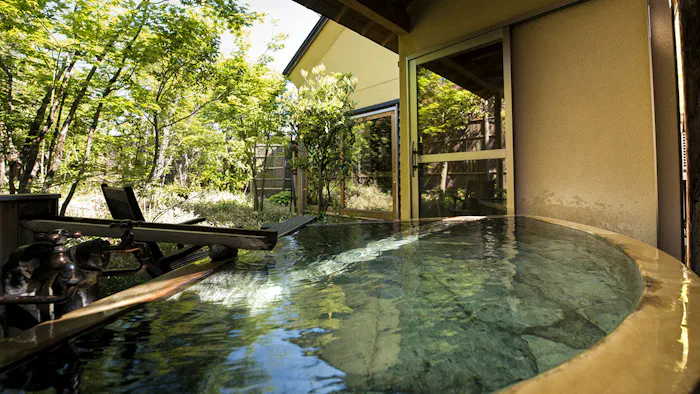湯は、昔から傷によく効くと伝わる含硫黄-ナトリウム・カルシウム-塩化物泉。チェックアウトが12時だから、湯浴みの回数がいつもより多くなるのは必至。大浴場もありますが、庭を眺めながら入るお部屋の露天風呂だけで、十二分に満足してしまいそうです。