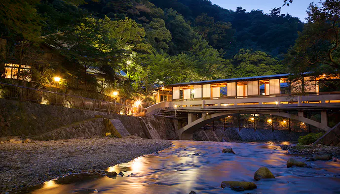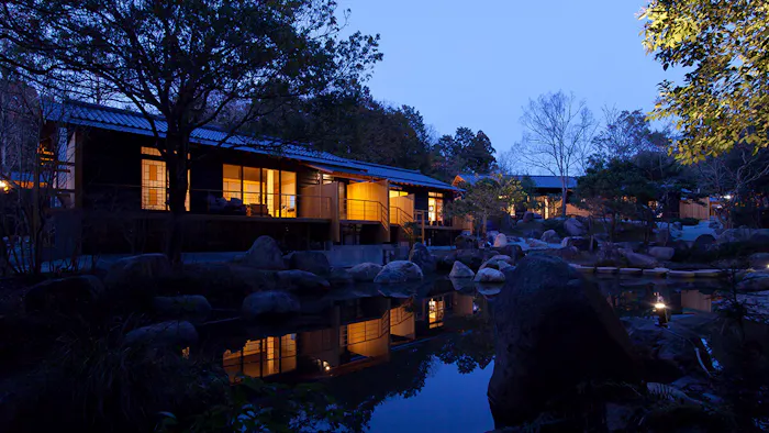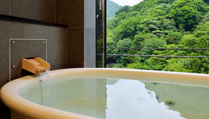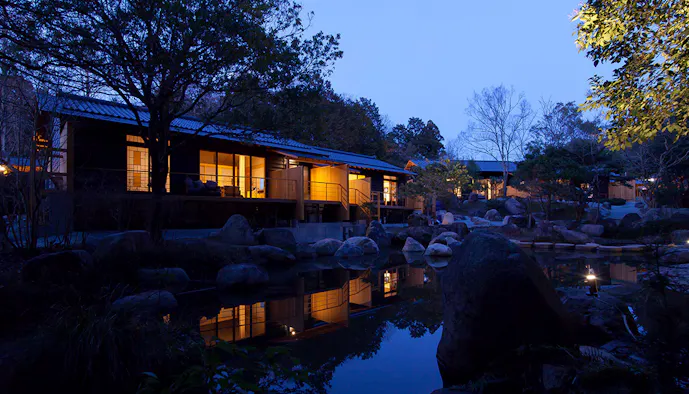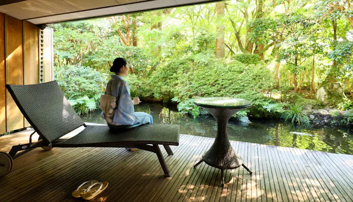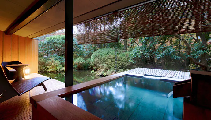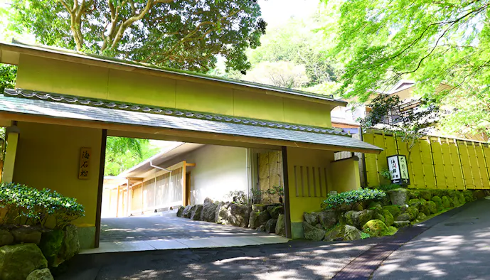 ちょうど箱根の西南側、静かな山懐に立つ「海石榴 つばき」。本館と迎賓館(離れ)の2棟に意匠が異なるお部屋がいろいろ。全室でお部屋食が可能なほか、露天風呂付の客室も7室あって、贅沢なおこもりステイが叶います。