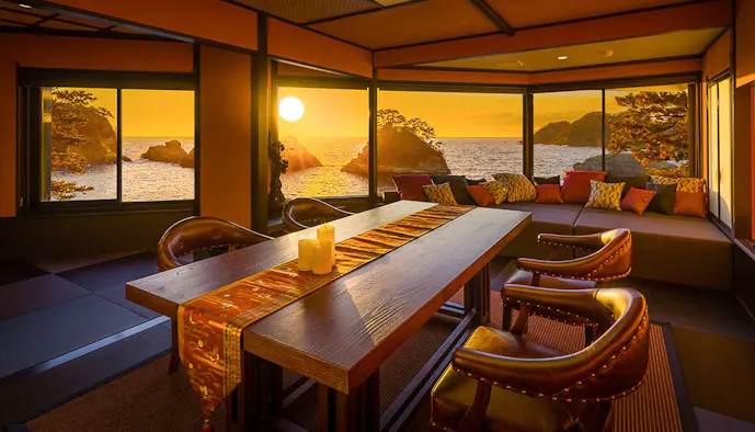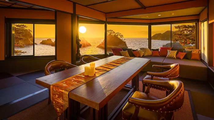 小島が浮かぶ堂ヶ島の海を見下ろすように立つ「繭二梁」。この宿のユニークな点は、通常のゲストルームのほかに、食事時や湯上り後に使用できるプライベートルームが別棟に設けられていること。それぞれで異なる景色が眺められるので、楽しみが2倍に。12時のチェックアウトまで、飽きずにおこもりステイを満喫できます。