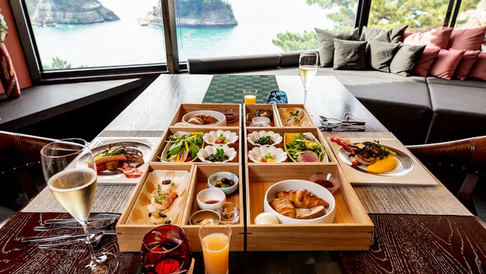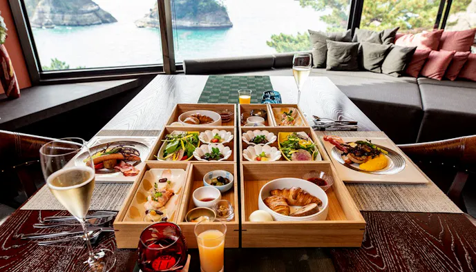 駿河湾産の伊勢海老や朝採りの野菜などを用いた創作フレンチの夕食と、三段重の朝食もどうぞお楽しみに。
