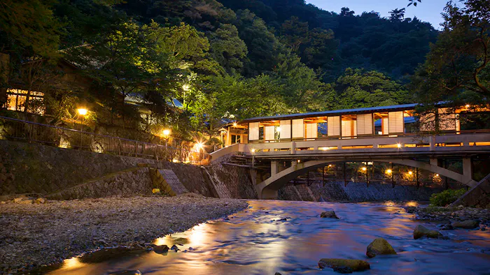 目の前に迫る落葉山と眼下に走る滝川。そんな有馬の景色を飽くまで眺めて過ごせるのが「有馬温泉 月光園 鴻臚館」。
