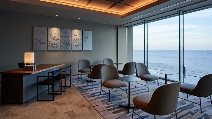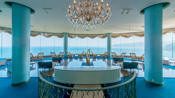 2023年12月オープンの「熱海・伊豆山 佳ら久(オリックス ホテルズ&リゾーツ)」。最上階のロビーに向かうと、一面ガラス張りの先にオーシャンビューが広がります。2つのゲストラウンジ「間(AWAI)」と「刻(TOKI)」では、海を眺めながら、こだわりの軽食やドリンクをいただきましょう。