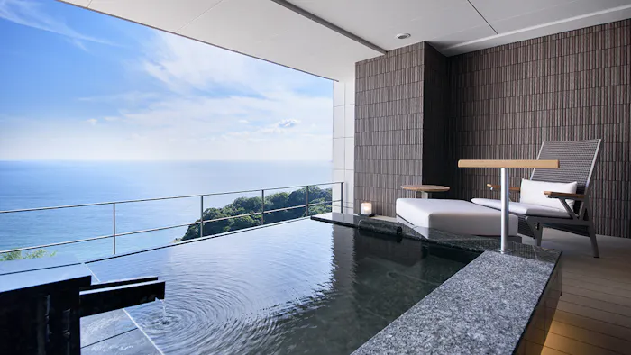 「UMITO VOYAGE ATAMI」は、さえぎるもののない熱海の絶景を楽しめる贅沢なリゾートホテル。全ての客室に、相模湾を望むテラスが付くスイート仕様で、波音を聴きながら大切な人とのひとときを過ごせます。