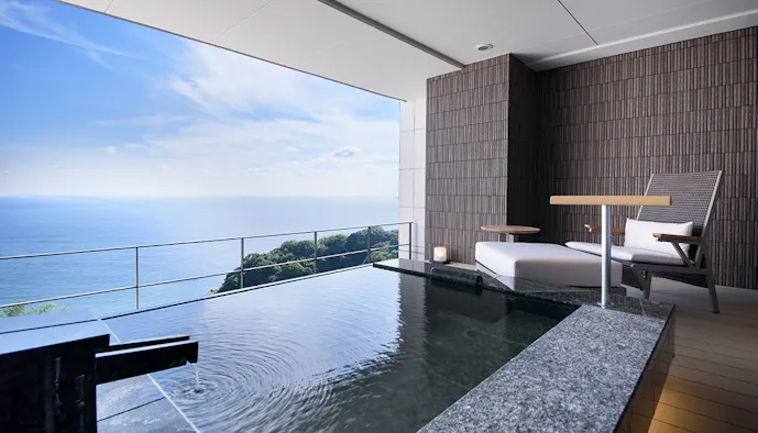 熱海の高台に立つ「ATAMI せかいえ」は、大海原を見晴らす絶景の宿。全室に源泉掛け流しの露天風呂が備わり、潮風を感じながら、非日常感に溢れた湯浴みが叶います。温泉を楽しんだ後は、快適で心地よいシモンズ社特注のベッドで寛ぎのひとときを。