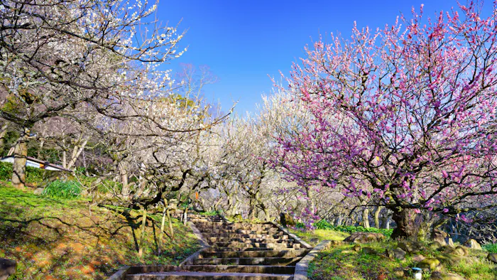 「熱海梅園」は、市街地西側のゆるやかな山間に位置し、三方を熱函道路などの主要道路に囲まれた4.4ヘクタールの都市公園。梅だけでなく楓や松、キバナアマやスイセンなど、四季を通して様々な花草木を楽しむことできます。