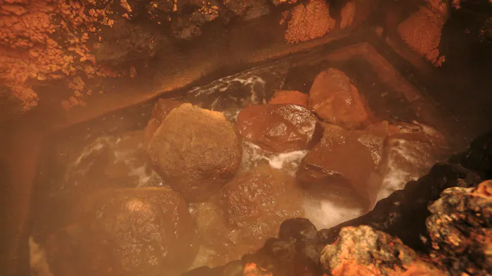 約1300年前、山肌から湯が飛ぶように海へと流れ落ち、この名がついた「走り湯」。日本三大古湯の一つで、かつては神湯としても信仰されました。奥行5メートルの洞窟に、今も70度の湯が湧き出ており、神秘的な光景が広がります。
