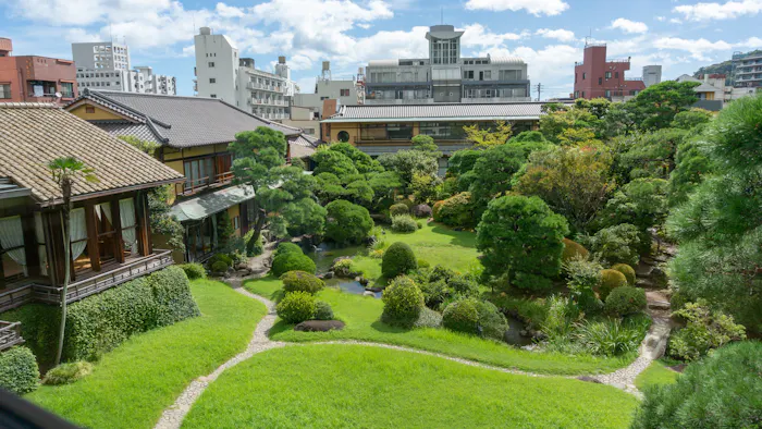 もとは熱海の3大別荘と称された名邸の「起雲閣」は、旅館として太宰治や三島由紀夫など著名人にも愛されていました。市街地とは思えない緑豊かな庭園と、日本家屋の本館と離れ、日本や中国、欧州などの建築様式と装飾を融合した洋館は、一見の価値あり。